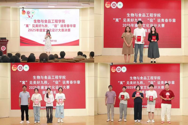 本网讯 10月10日晚,生物与食品工程学院“‘寓’见美好九秩,‘宿’说青春华章”2025年寝室文化设计大赛决赛在学术报告厅举行。经现场评审,男14-404等3个寝室获一等奖,男14-620等4个寝室获二等奖,女3-106等4个寝室获三等奖。