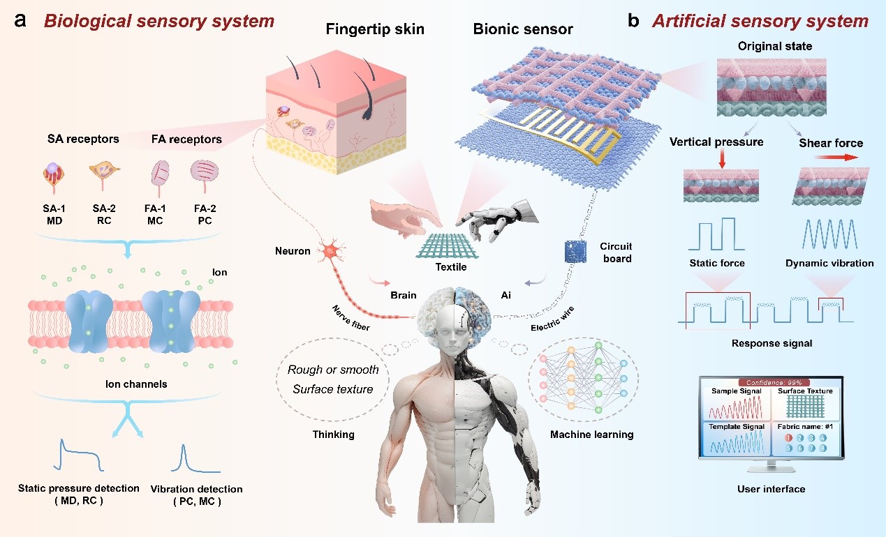 传统触觉传感器需多层电路分别模拟静态压力和机械振动感知,导致设备笨重、信号易干扰。针对上述问题,该研究团队研发出一种仿生纺织触觉传感器及系统,首次在单一器件中实现静态力与动态振动的高精度同步感知,让机器人触觉迈入新纪元。该传感器具有高灵敏度、快速响应恢复速率,以及双模感知的功能,精准还原触觉细节。此外,团队将传感器与机器学习算法结合,打造全自动纹理识别系统,对21种面料的识别精度超98.9%,最高达100%;支持50-300毫米/秒的扫描速度,远超同类技术;即使在曲面、海绵等复杂表面,识别精度仍保持95%以上,展现强大鲁棒性。该传感系统在智能假肢、人形机器人和虚拟现实等方面具有广阔的应用前景。